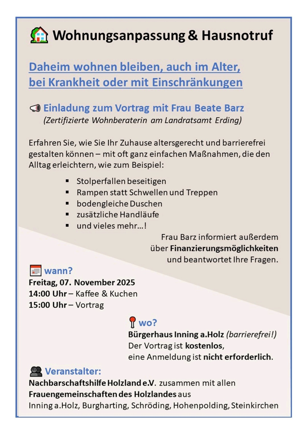 Die Veranstaltung wurde von der Nachbarschaftshilfe Holzland e.V. in Zusammenarbeit mit den fünf Frauengemeinschaften aus Burgharting, Hohenpolding, Inning a.Holz, Schröding und Steinkirchen organisiert. Vor dem Vortrag konnten sich die Teilnehmer bei kostenlosem Kaffee und Kuchen stärken.